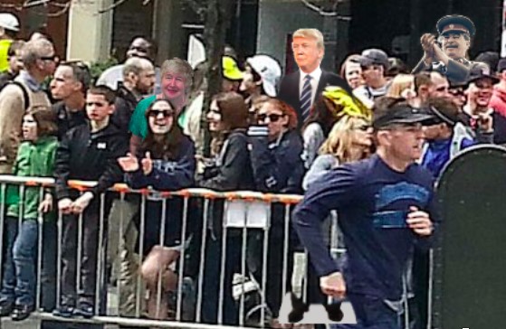 Here is a clear shot of the brothers, allegedly at the 2013 Marathon. Most likely it was taken BEFORE 2013. Note Tamerlan’s lack of a beard. His family insists that he grew a beard for religious reasons in 2012 and never shaved it off. I think Jahar, too, is looking a bit young there. The facial features seem OK. I guess it tp be a real shot of the Tsarnaev;s but INSERTED like Trump and Stalin.